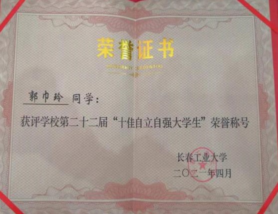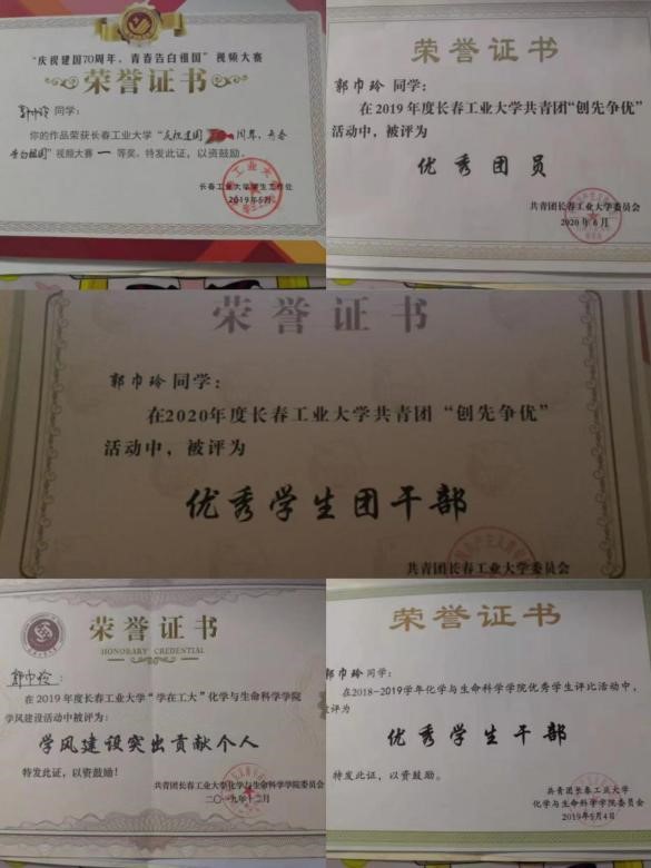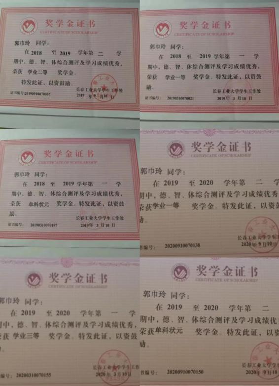 在校期间,曾获得2次国家励志奖学金,9次学业奖学金,3次单科状元;获得2020年度“长春市优秀共青团员”称号、太阳集团tyc138第二十二届“十佳自立自强大学生”、获得校第十六期青马班培训“优秀学员”、校“文明大学生”荣誉称号、校“优秀团干部”、校“优秀团员”,院“优秀学生干部”“学风建设突出贡献个人”等。在学院内开展学习经验分享会,分享学习心得,考研心得,帮助学弟学妹们复习方向及方法,激发同学们学习的热情。