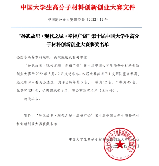 (通讯员:刘浩)2022年3月-12月,由中国石油和化学工业联合会、中国化工教育协会、中共广饶县委、橡胶谷集团有限公司等部门主办,中共广饶县委组织部、广饶县科学技术局、橡胶谷集团有限公司运营中心、青岛科技大学广饶橡胶工业研究院承办的“孙武故里·现代之城·幸福广饶”第十届中国大学生高分子材料创新创业大赛落下帷幕。