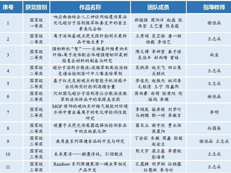 我院共有37支队伍参赛,经过前期资格审查、网络评审、省赛环节,我院有两支队伍进入决赛,决赛采取现场答辩的方式进行,由现场汇报、评委提问、评委现场亮分等环节组成。学院参赛学生团队反复打磨完善参赛作品,在决赛中沉着冷静、思路清晰、自信应答,获得评委的认可。由我校tyc33455cc太阳成集团谢佳函老师指导,郝骏强同学带领的《响应曲面结合人工神经网络遗传算法优化超分子溶剂微萃取秦皮中的香豆素类化合物》荣获国家级一等奖,由尚垒老师指导、隋文博同学带领的《强韧新机“智”——生物基纤维素纳米纤维-离子液体配合体增强增韧环氧树脂复合材料的制备与研究》等3项作品荣获国家级二等奖,由孙国英老师指导、翟长玉同学带领的《碳量子点荧光传感器选择性检测食品中的亚铁氰化钾》等7项作品荣获国家级三等奖。另荣获省级二等奖4项、三等奖9项。