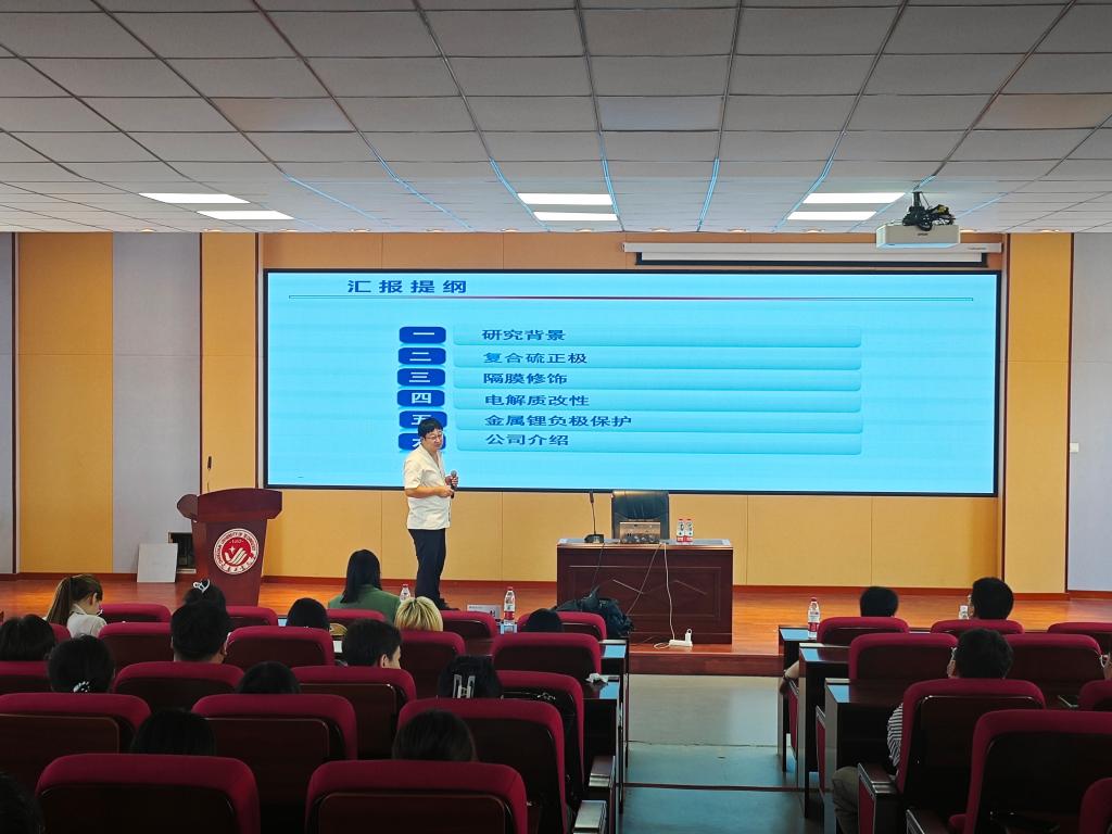 2006届化学专业校友王钊,现任吉林师范大学教授。他向在场师生分享了当年求学的难忘往事和最新学术研究,并讲述了一篇题为《锂硫电池核心部件的研发与开发》的学术报告。从低空经济中无人机电池的量产出发,介绍了电池研究的重要意义和研究背景,抛砖引玉的为大家详细的讲解锂硫电池核心技术的研发和结构设计。团队研究将复合硫注入碳化钼中,从而达到有效抑制飞梭效应,提高硫的利用率,在复合硫正极起到显著效果。利用多硫化锂和红磷的反应进行隔膜修饰等一系列改进策略,并举例说明了锂硫电池技术的推广和实际应用。王钊教授还细心介绍了公司详情和联系方式,欢迎工大人才踊跃加入。