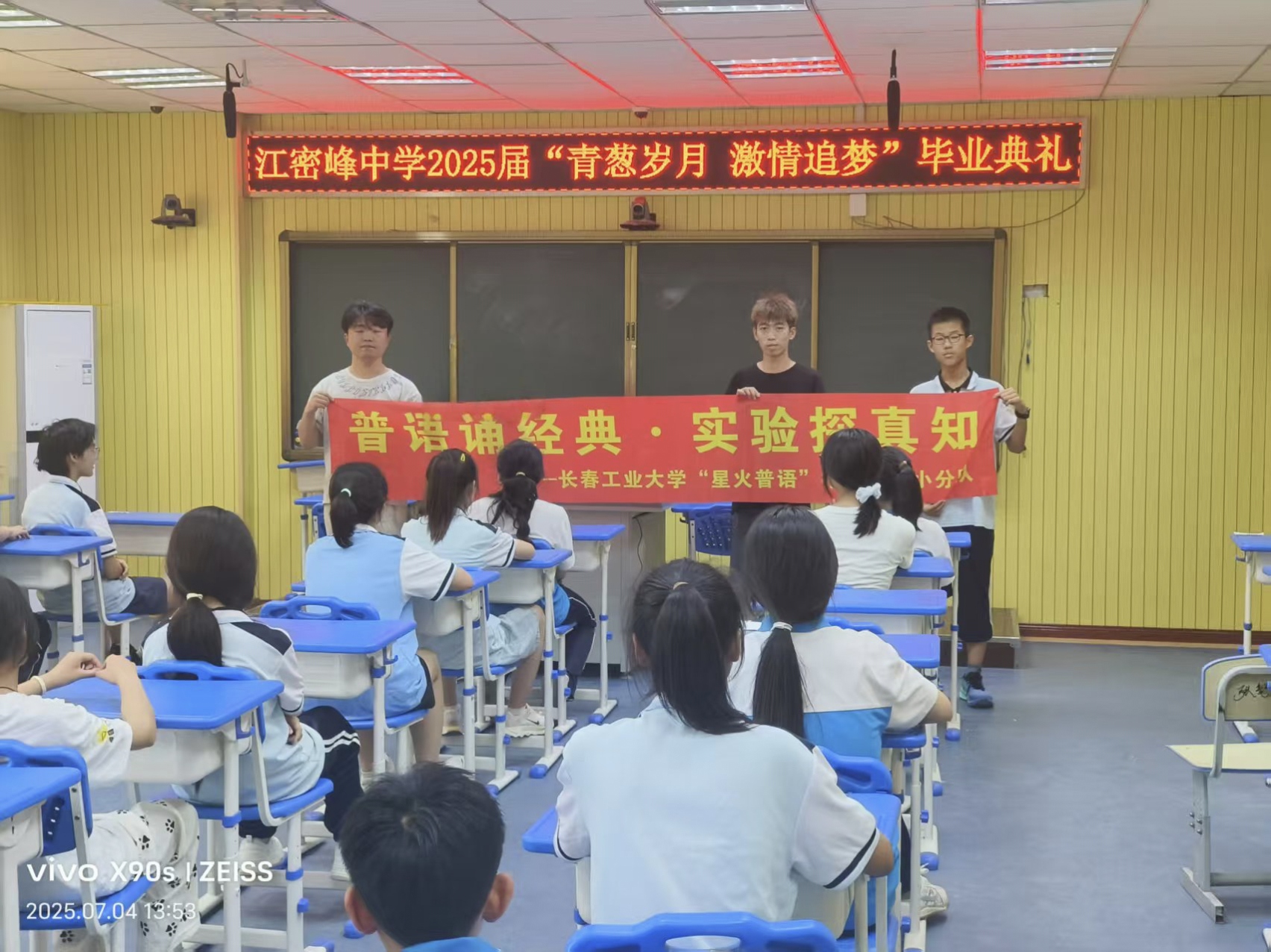 本网讯(通讯员:滕昊燃)为深入贯彻落实国家语言文字方针政策,助力提升乡村学校学生的普通话水平,传承和弘扬中华优秀语言文化,近日,tyc33455cc太阳成集团“星火普语”小队走进吉林省吉林市江密峰中学,开展了以“普语诵经典·实验探真知”为主题的推普实践活动。
