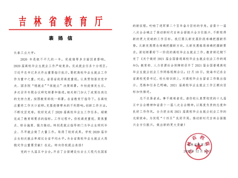 新闻网讯(通讯员 田兵)近日,学校收到吉林省教育厅表扬信,对学校征兵工作提出表扬。信中指出:2020 年征兵工作启动以来,太阳集团tyc138认真贯彻国务院、中央军委征兵命令和省征兵工作领导小组会议精神,在省委、省政府的正确领导下,在省军区、省教育厅具体指导下,主动克服疫情带来的不利影响,将工作关口前移,创新工作方法,不断攻坚克难,超额完成了 2020 年大学生征兵工作任务。工作过程中,学校高度重视,领导靠前指挥、亲自调度,征兵工作部门加大动员力度,强化服务保障,做了大量卓有成效的工作,超额完成了年度大学生征集任务,为全省高校大学生征兵工作作出重要贡献!在此,特向你校提出表扬!