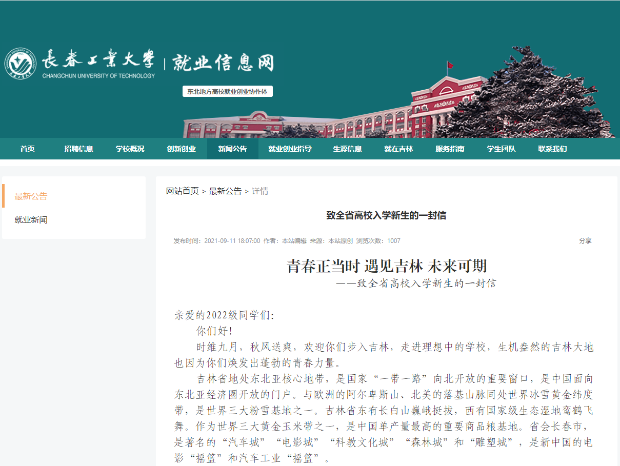 二是传达一封写给新生的信。学校通过校院两级网站、微信公众号面向全体新生和家长推送了《青春正当时 遇见吉林 未来可期—致全省高校入学新生的一封信》和《太阳集团tyc138致全体新生家长的一封信》,以深情的笔触,表达了对同学们在吉林大地一展身手、建功立业、实现梦想,书写无悔青春的殷切期望,如暖流入心,似春风拂面,极大地激发了同学们留省就业创业的热情。大家纷纷表示,两封信的内容句句饱含深意,字字充满期望,阅读以后备感振奋,更加明晰了成长方向,在接下来的大学生活中,将珍惜宝贵年华、树立报国之志、练就实干之功,成为吉林全面振兴全方位振兴的生力军。
