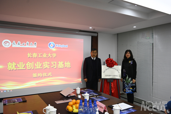 校长张明耀与我校计算机系1997级校友、上海复深蓝软件股份有限公司董事、联合创始人兼副总裁靳翠共同为实习基地揭牌